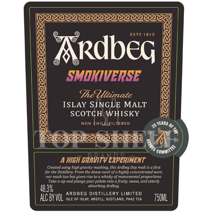 In Ardbeg SMOKIVERSE, energetic aromas of ripe BARLEY and AROMATIC SMOKE make for a turbulent nose. Venture further and discover TROPICAL FRUITS and CLOVE. Finally, PEAT MOSS and BONFIRE EMBERS fuse in a finish that blazes on.