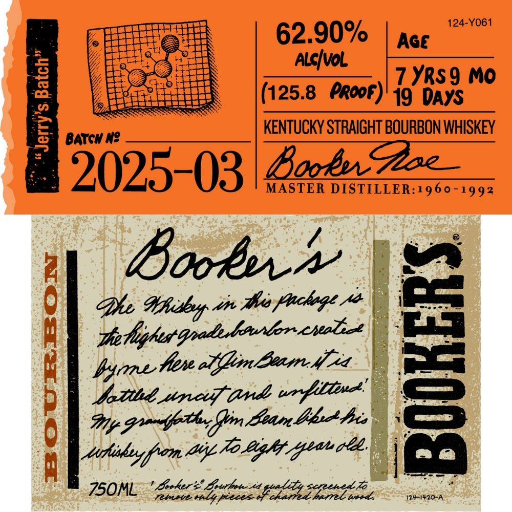 Booker's Bourbon 2025-03 “Jerry’s Batch” is a powerful Kentucky straight bourbon whiskey, bottled at a robust 125.8 proof (62.9% ABV). Aged for 7 years, 9 months, and 19 days, this limited release offers a full-bodied flavor profile with rich notes of caramel, vanilla, and oak, complemented by a hint of spice. The high proof delivers a bold, warming experience, making it perfect for sipping neat or with a splash of water to unlock its depth. Crafted with care and precision, this batch honors the legacy of the Beam family with its exceptional, uncut, and unfiltered quality.
