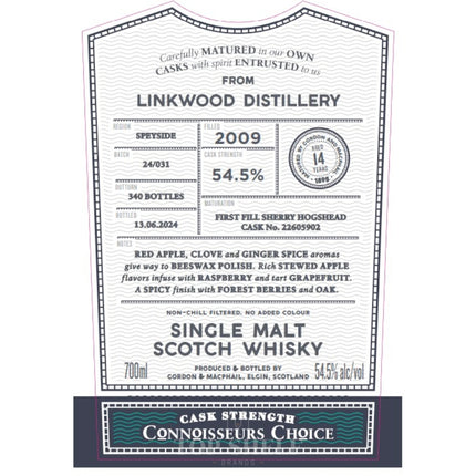 Discover the elegance of Gordon & MacPhail's 2009 Linkwood 15 Year Old Connoisseurs Choice, a testament to the art of whisky maturation and the storied heritage of the Speyside region. Carefully matured in our own casks, this exceptional spirit is entrusted to us by the renowned Linkwood Distillery.