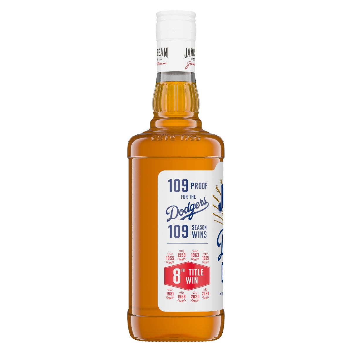 Jim Beam Limited Edition Los Angeles Dodgers Kentucky Straight Bourbon Whiskey is a special 109-proof Kentucky straight bourbon whiskey, crafted to honor the Dodgers' 109th season and 8th title win. Aged for four years in American charred new oak barrels and sour mashed for exceptional quality, this bourbon delivers rich, robust flavors with hints of caramel, vanilla, and oak, making it a fitting tribute to a legendary season.